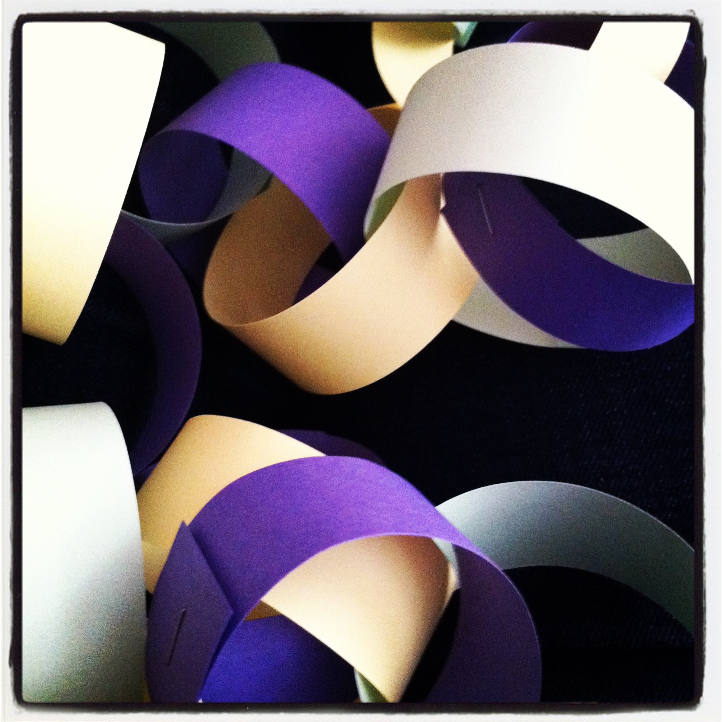 I made simple handmade paper chains using the same three colours. I used thin coloured card and cut strips measuring 8 inches long by 1 inch wide. I used my paper trimmer to help cut up the strips as I made around 8 to 10 metres of paper chains to decorate a room. I stapled the chains together for speed and used a small stapler. I also sourced pretty pearlescent purple and ivory coloured balloons and tied them together with purple ribbon.