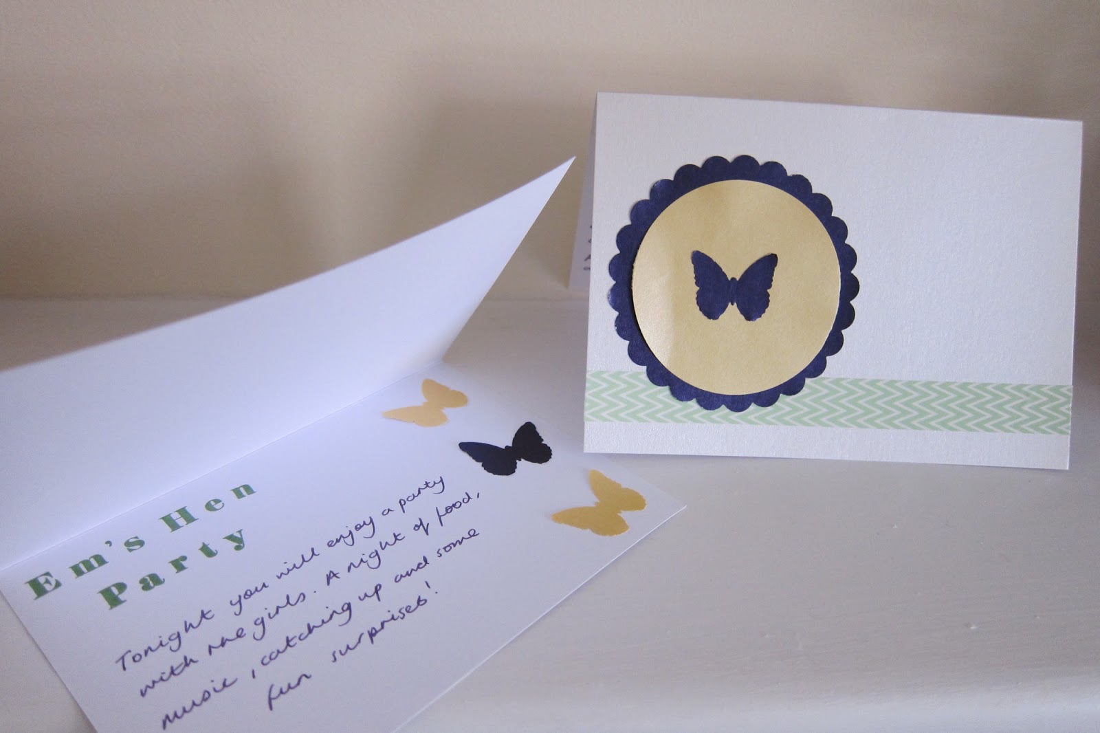 All of the events during the party weekend were a surprise for the bride-to-be. Before every big event over the weekend I handed her a handmade card providing details of what was happening next. These cards were created using pearlescent purple and yellow paper and card from Paperchase and some pretty mint green washi tape. I used a circular paper punch, scalloped circle punch and a Martha Stewart Butterfly punch to create a layered design on the front. Using green pearlescent ink I created a stamped message inside, punched some butterflies, and wrote a different message in each card providing more details of each stage of the weekend. I wanted to make sure that there was a record of every special event organised for the weekend so she could look back and remember.