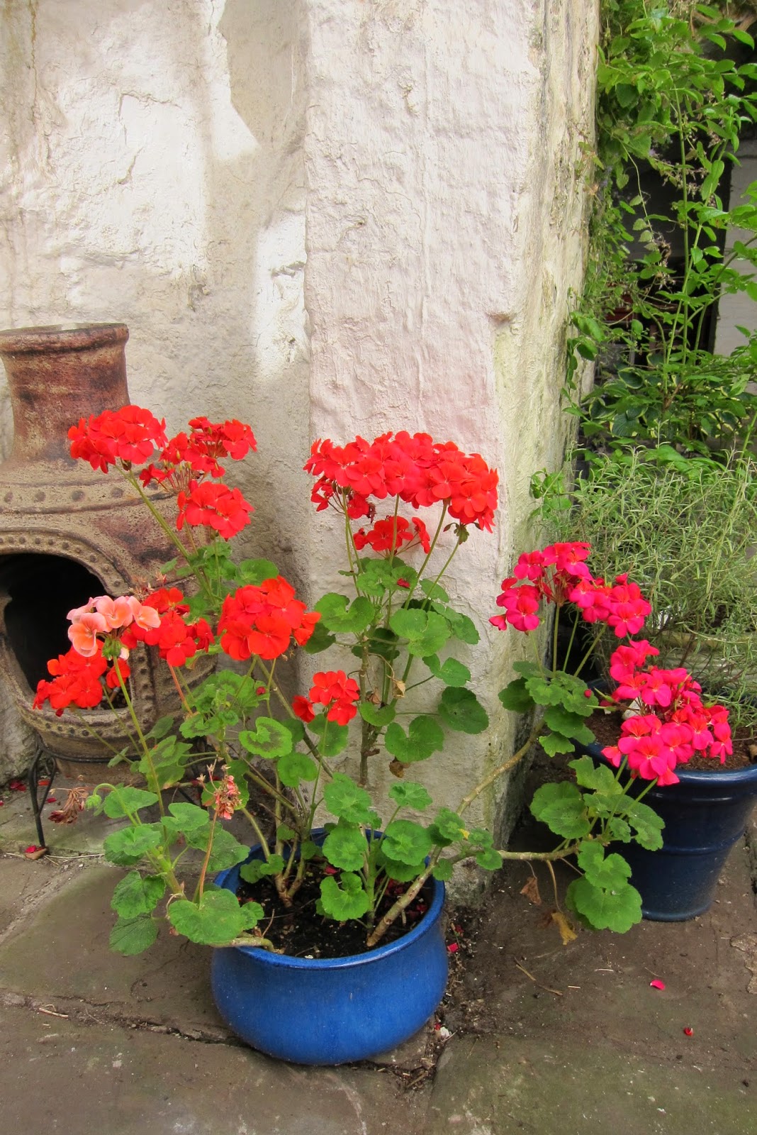 These geraniums have been growing for a few years now and have delivered some gorgeous bright red and pink blooms. I love how they contrast with the blue pot. I have a little bit of an obsession with blue glazed pots...