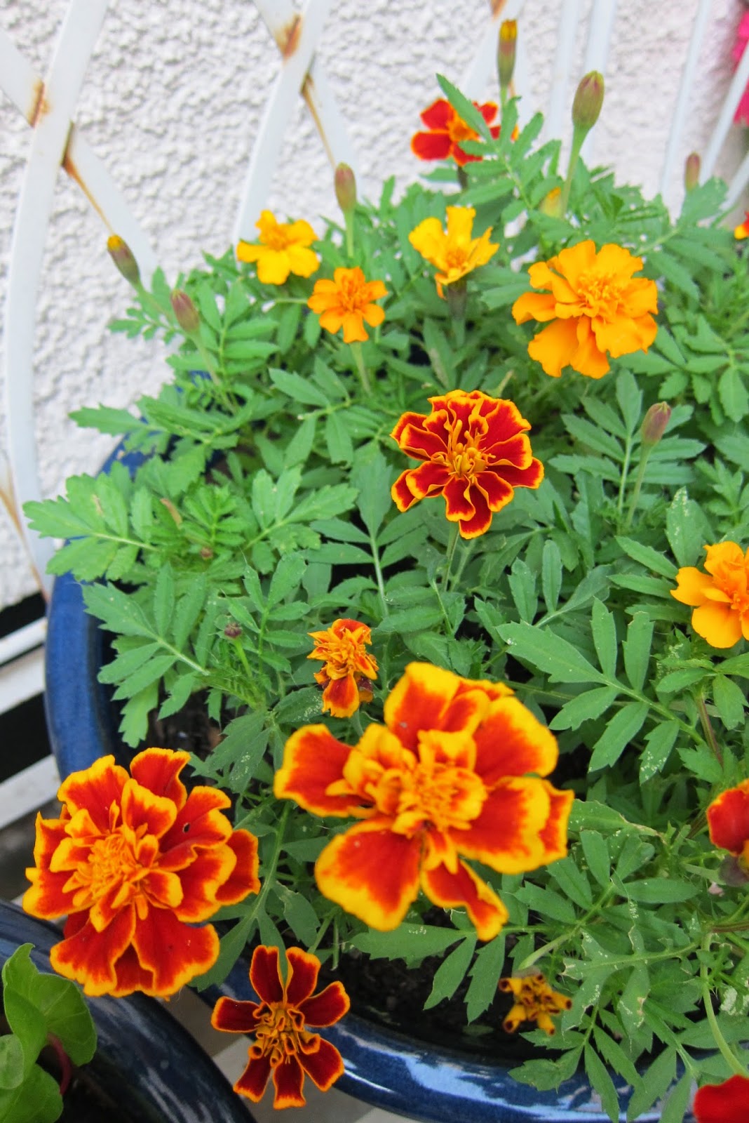 I grew marigolds from seed this year and I can't tell you how excited I am by seeing each plant flower one by one. I have a few containers of these flowers and I am so happy with how they are growing.