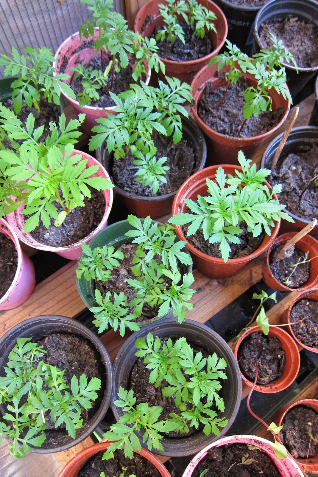 These are the marigolds I've grown from seed. I've been growing them in my cold frame in a partially sunny spot. I started planting these up into bigger containers this evening... I'm loving the long evenings of the summer, I'm getting so much gardening time in my week!
