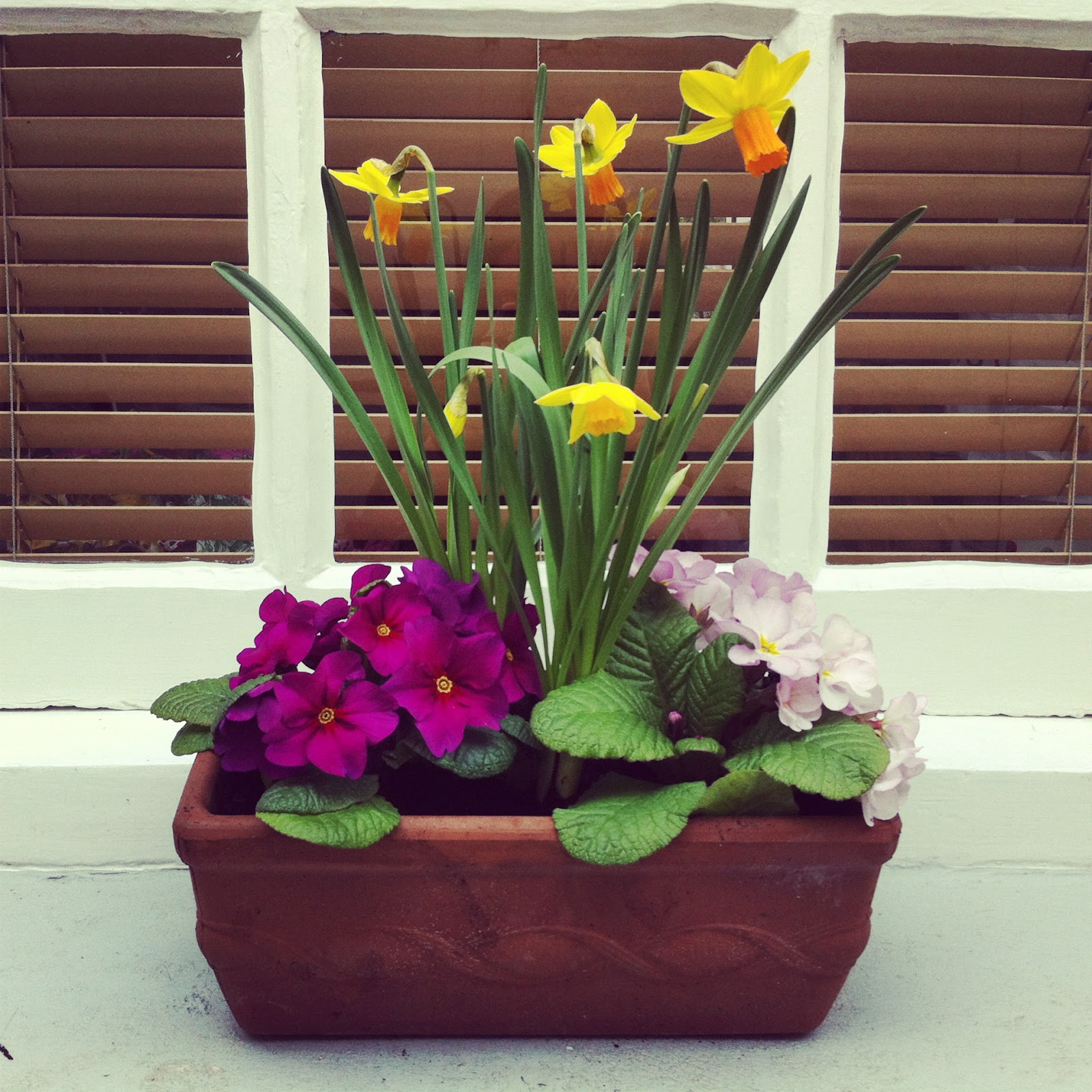 We have a few chunky windowsills that do get some light, so I took the plunge and a few weekends ago I planted some window boxes to brighten up the window sills. I wanted to make the most of the spaces that get the most sunlight and usher in the spring with some cheerful primroses and narcissus…oh and look how they’ve bloomed! I love seeing these happy flowers when I look out of our windows.
